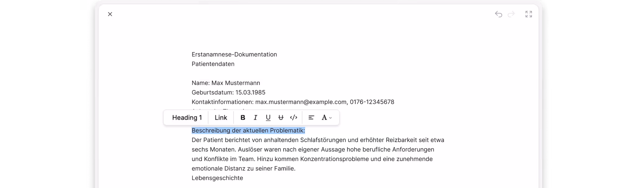 Verlaufsdokumentation, die sich wie ein moderner Editor anfühlt. Arbeiten Sie mit flexiblen Blöcken, strukturieren Sie Inhalte übersichtlich und erstellen Sie eigene Vorlagen für wiederkehrende Dokumentationsabläufe.