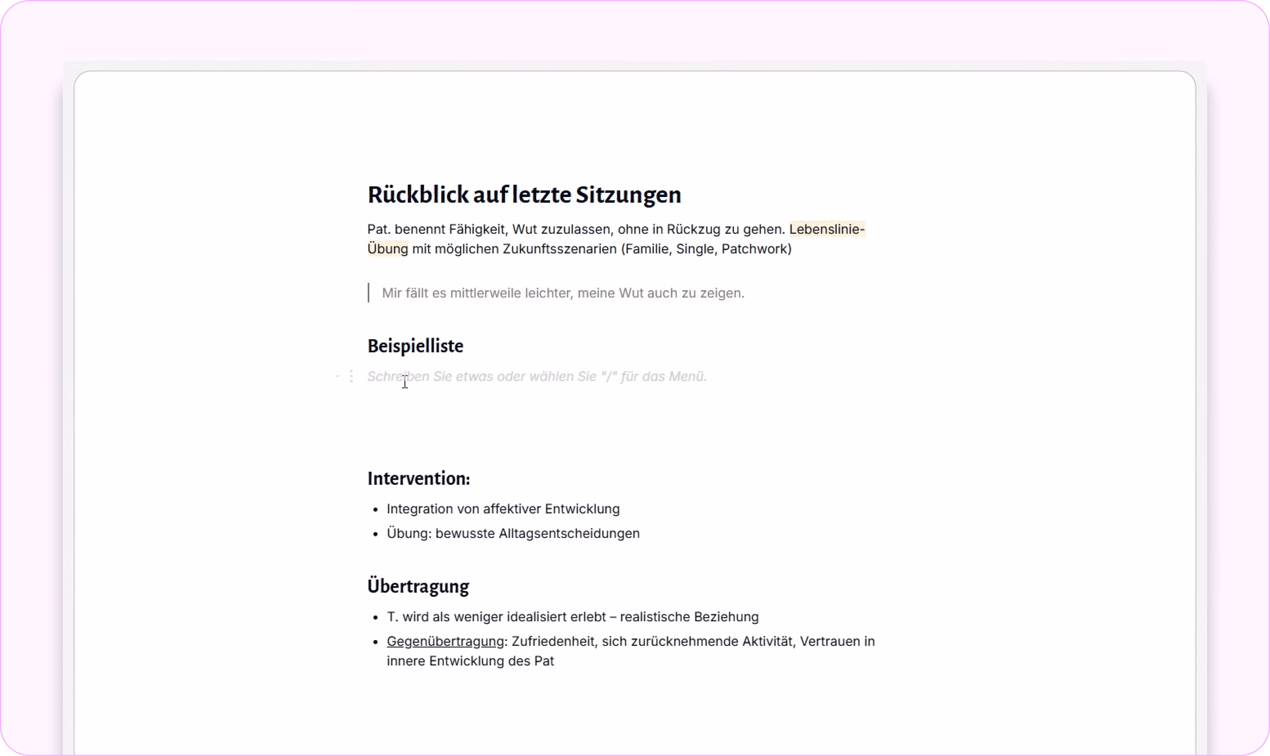 Die Oberfläche ist auf den Praxisalltag ausgelegt und ermöglicht es, Einträge schnell zu erfassen oder später zu ergänzen, auch zwischen Sitzungen.