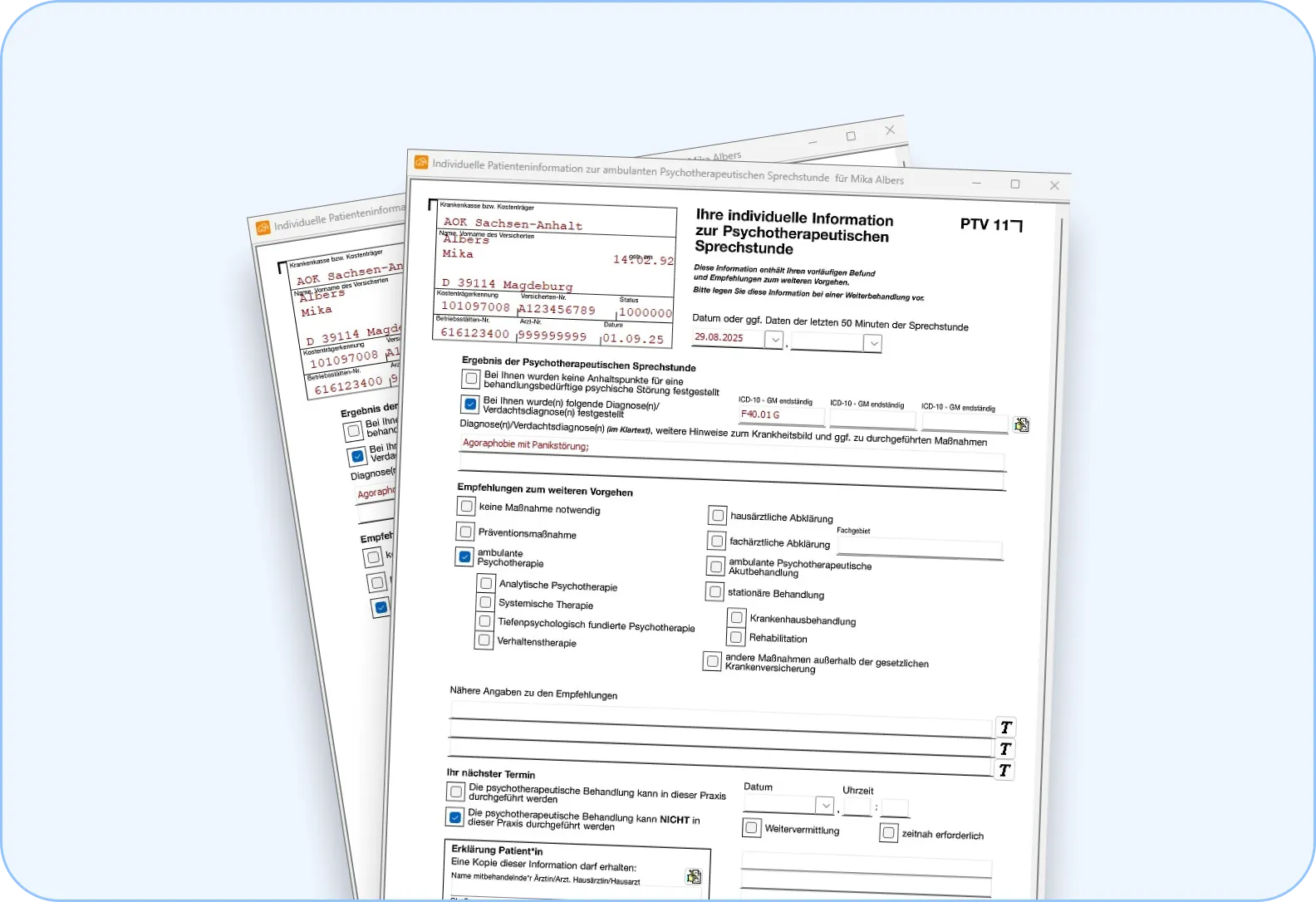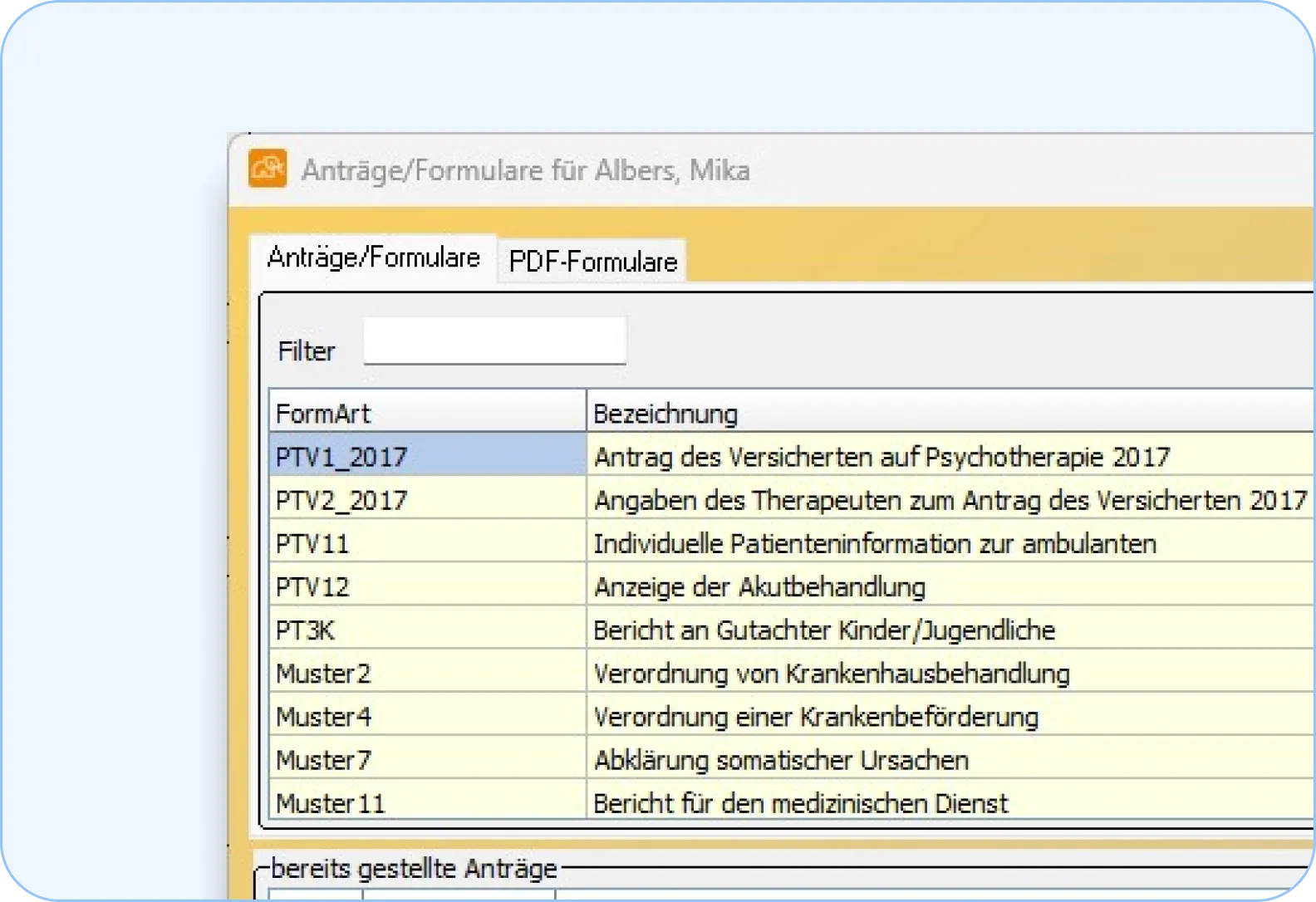 In Elefant finden Sie alle benötigten Formulare und Anträge. Der oft mühsame Antragsprozess für Richtlinientherapie wird mit den notwendigen PTV-Vorlagen spürbar erleichtert. Auch das Formular für somatische Abklärung (Muster 7), den Konsiliarbericht (Muster 22) und viele weitere sind standardmäßig enthalten.